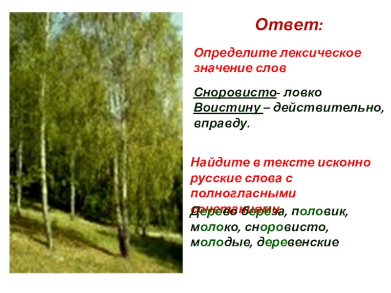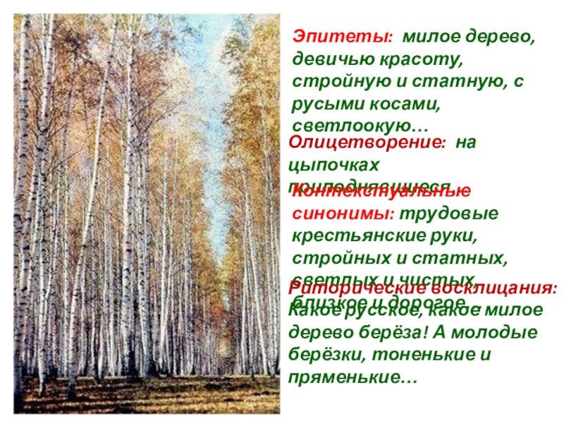 Слайд 26Эпитеты: милое дерево, девичью красоту, стройную и статную, с русыми косами,