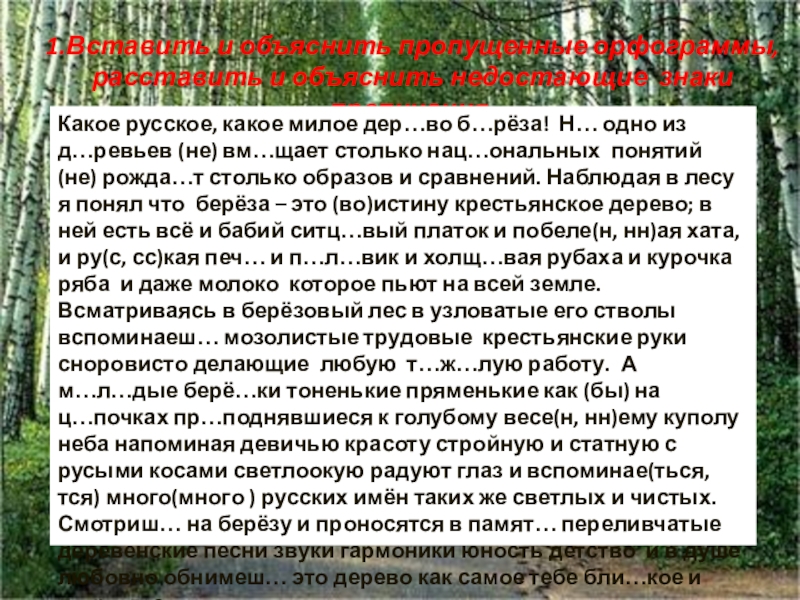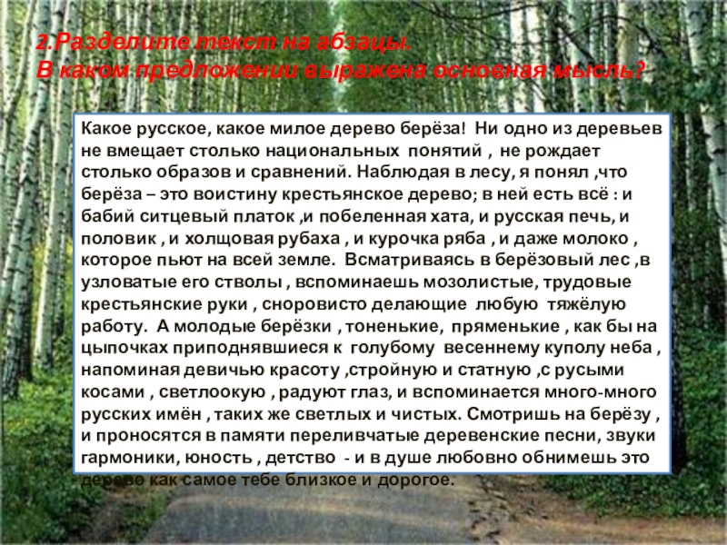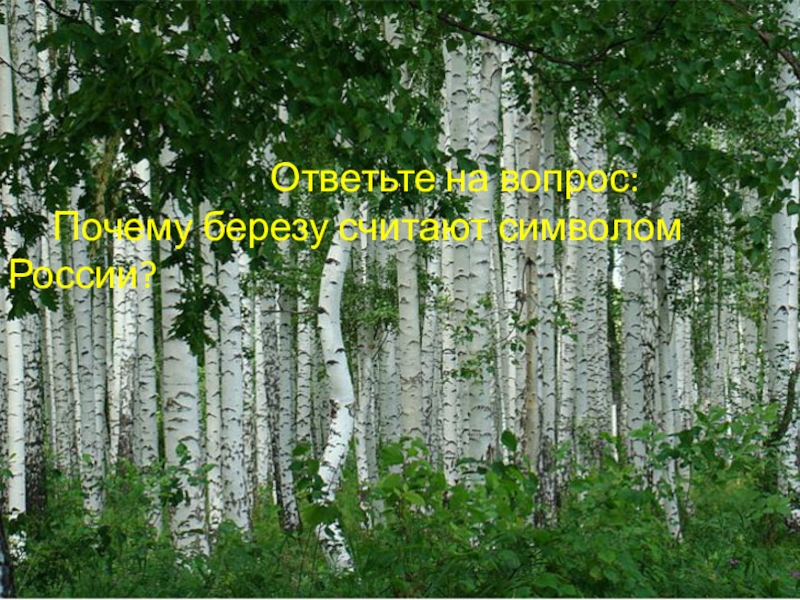 Какое русское, какое милое дерево берёза! Ни одно из деревьев не вмещает столько национальных понятий , не рождает столько образов и сравнений.