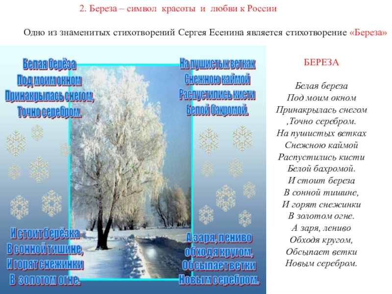 В стихотворении автор передает удивительную красоту березы – символа Руси.
