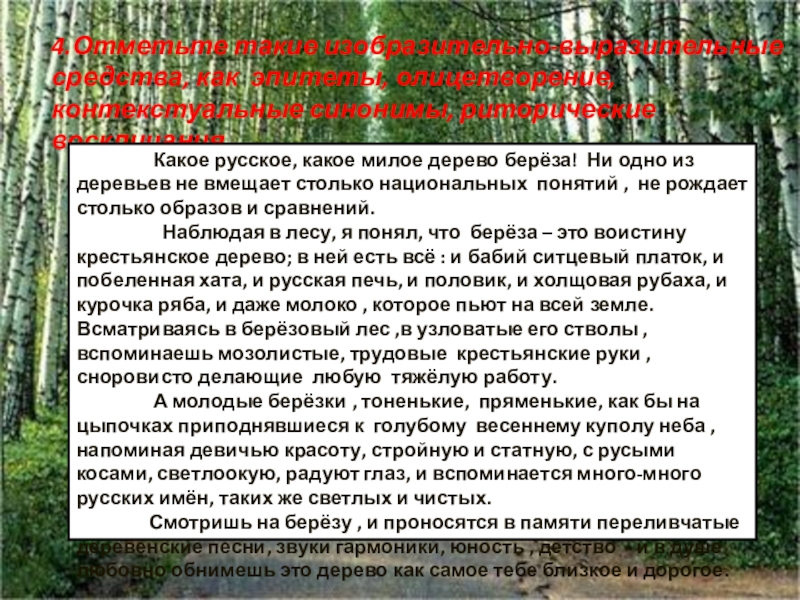 Слайд 254.Отметьте такие изобразительно-выразительные средства, как эпитеты, олицетворение, контекстуальные синонимы, риторические восклицания.
