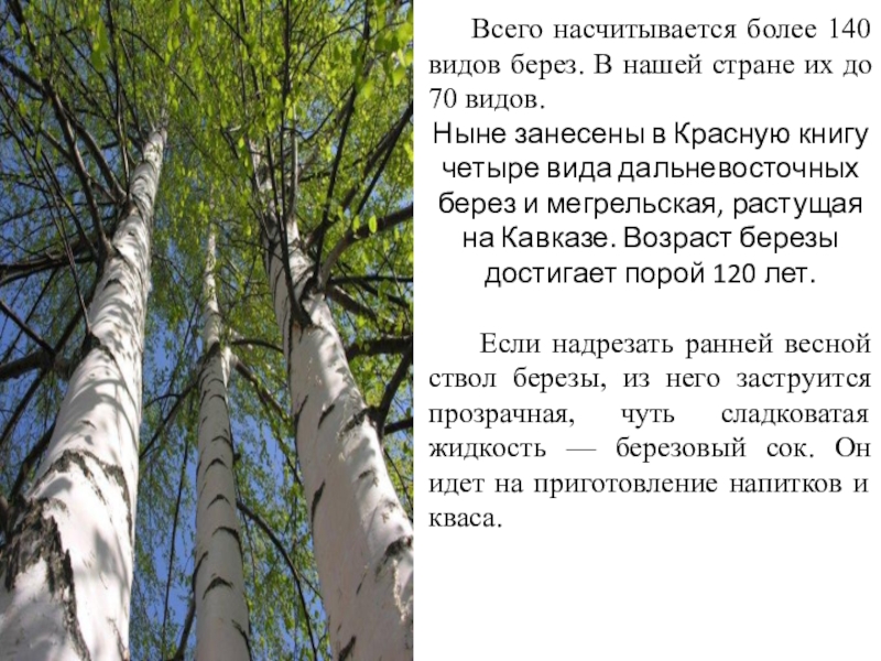 Слайд 5Всего насчитывается более 140 видов берез. В нашей стране их до