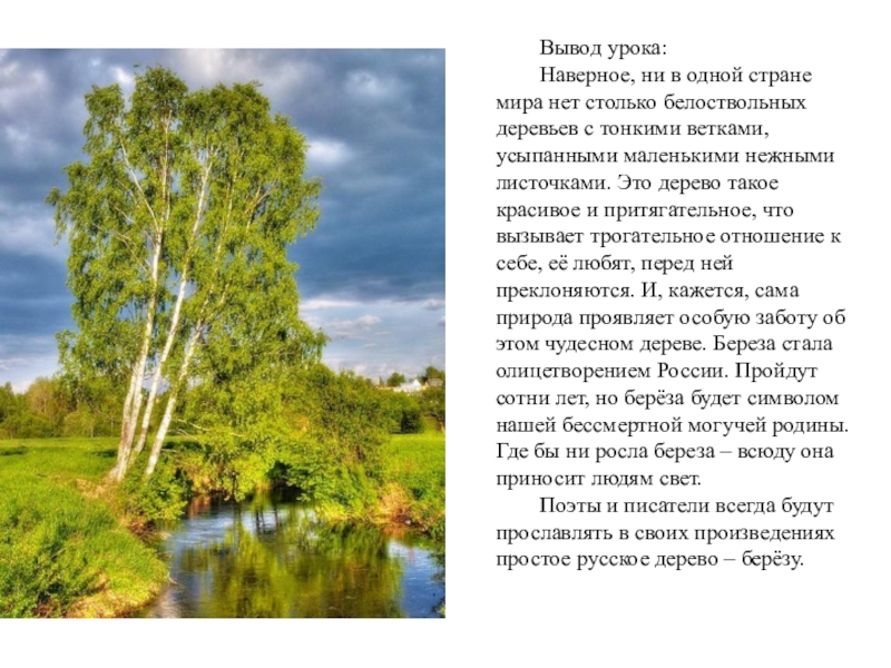 с тонкими ветками, усыпанными маленькими нежными листочками. Это дерево такое красивое и притягательное, что вызывает трогательное отношение к себе, её любят, перед ней преклоняются. И, кажется, сама природа проявляет особую заботу об этом чудесном дереве. Береза стала олицетворением России. Пройдут сотни лет, но берёза будет символом нашей бессмертной могучей родины. Где бы ни росла береза – всюду она приносит людям свет.