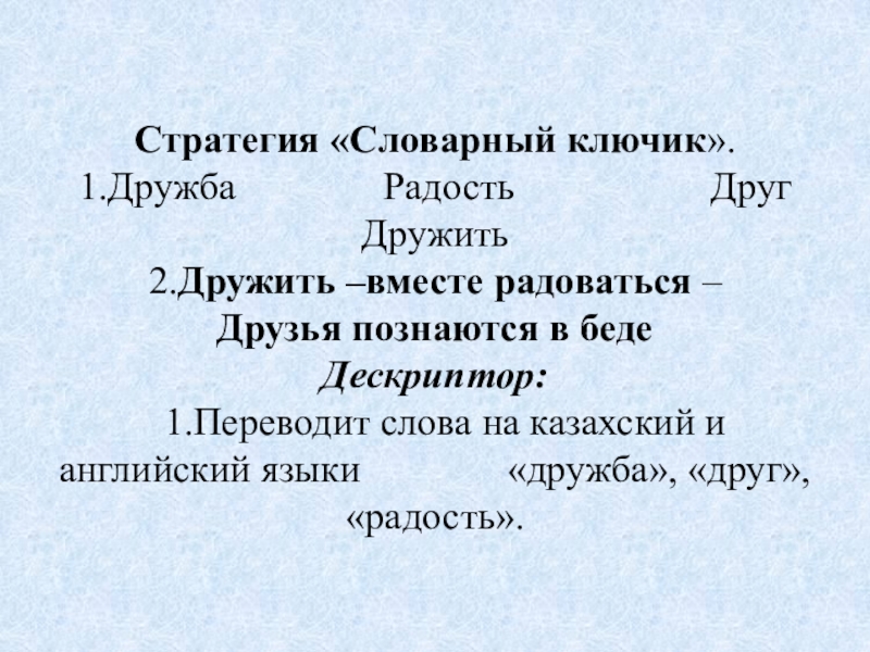 Слайд 5 Стратегия «Словарный ключик». 1.Дружба