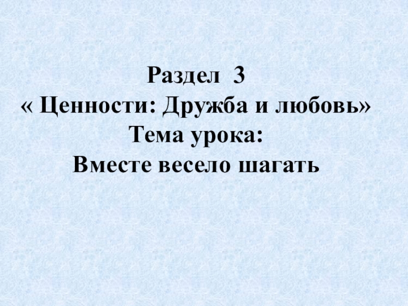 Слайд 1Раздел 3 « Ценности: Дружба и любовь» Тема урока: Вместе весело шагать