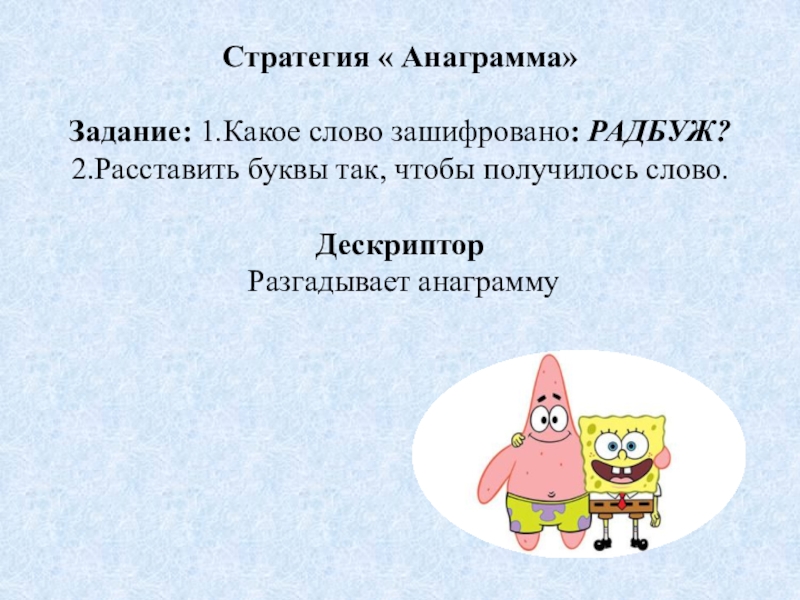 Слайд 3 Стратегия « Анаграмма» Задание: 1.Какое слово зашифровано: РАДБУЖ? 2.Расставить буквы так, чтобы