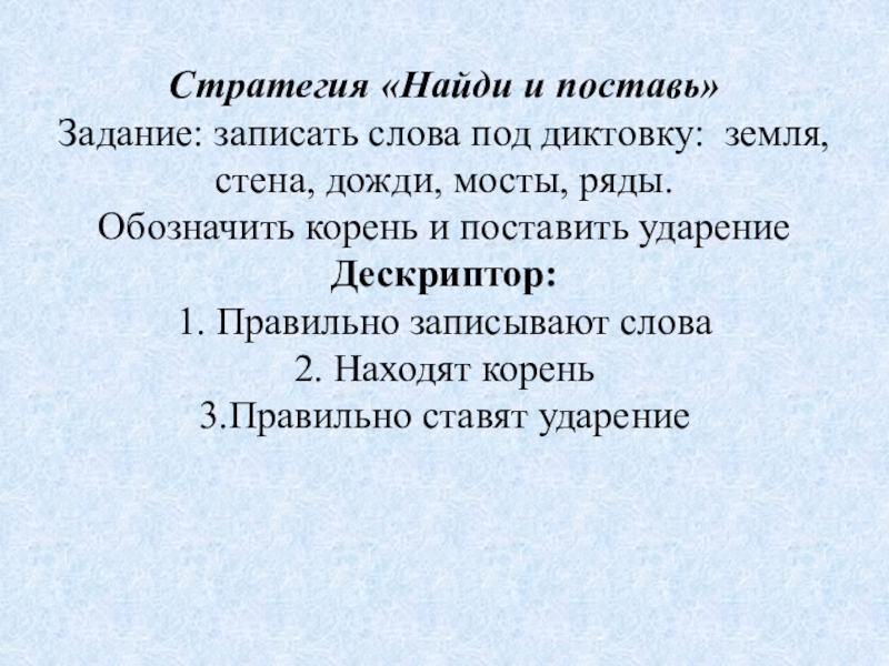 Слайд 4 Стратегия «Найди и поставь» Задание: записать слова под диктовку: земля, стена, дожди,