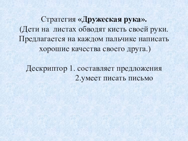 Слайд 8Стратегия «Дружеская рука». (Дети на  листах обводят кисть своей руки.  Предлагается на каждом пальчике написать    хорошие качества своего друга.)   Дескриптор 1. составляет предложения
