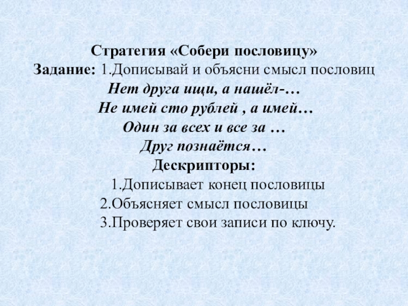 Слайд 7Стратегия «Собери пословицу» Задание: 1.Дописывай и объясни смысл пословиц Нет друга ищи,