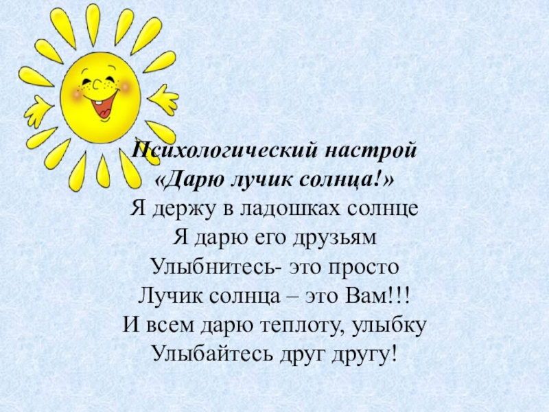 Слайд 2 Психологический настрой «Дарю лучик солнца!» Я держу в ладошках солнце Я дарю его
