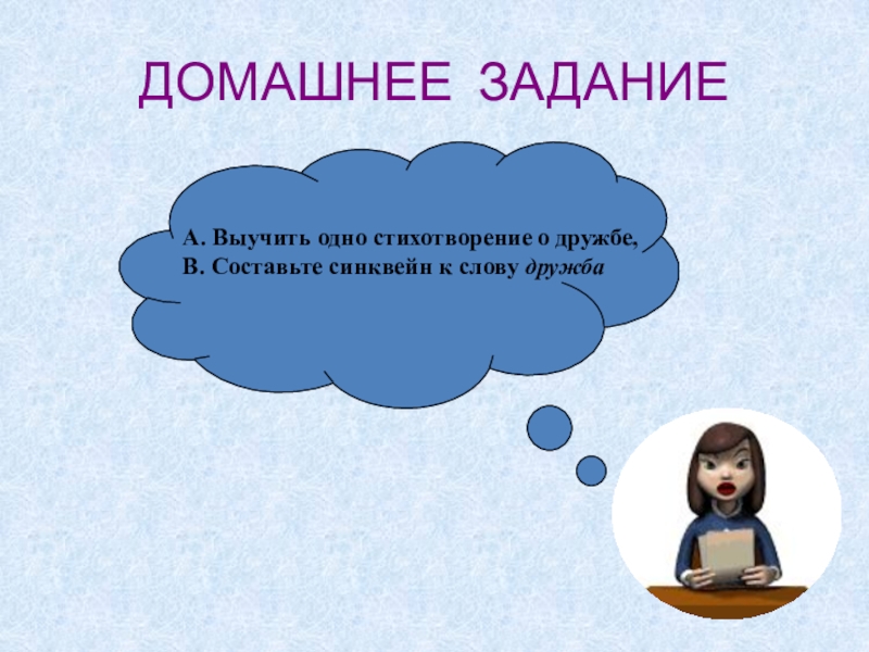 ДОМАШНЕЕ ЗАДАНИЕА. Выучить одно стихотворение о дружбе,В. Составьте синквейн к слову дружба