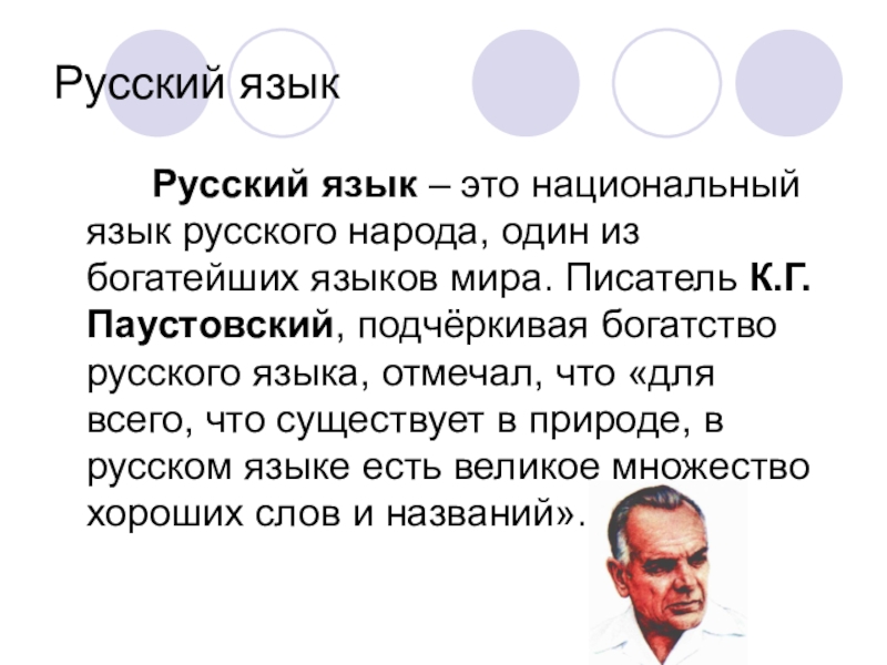 язык русского народа, один из богатейших языков мира. Писатель К.Г. Паустовский, подчёркивая богатство русского языка, отмечал, что «для всего, что существует в природе, в русском языке есть великое множество хороших слов и названий».
