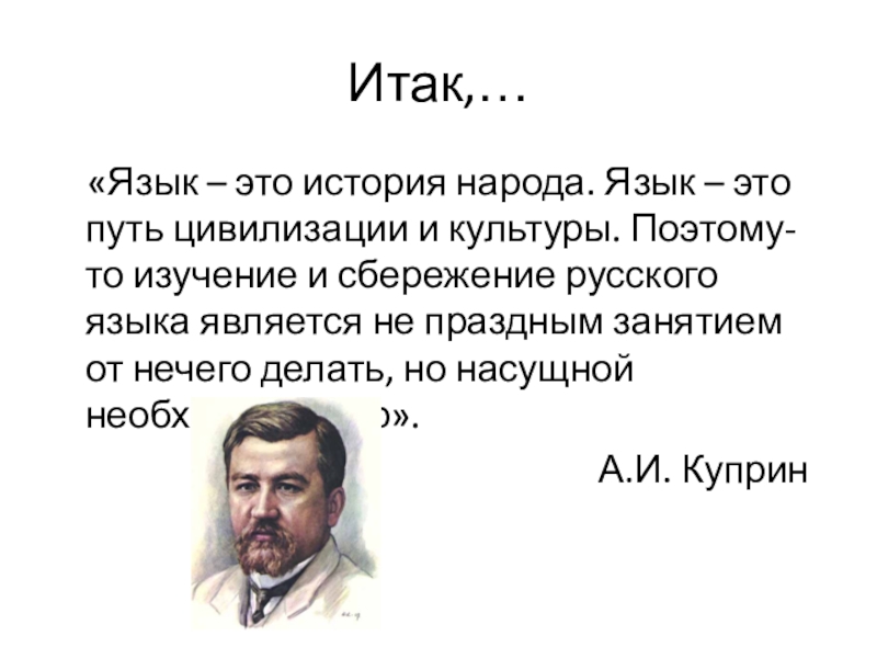 Итак,…  «Язык – это история народа. Язык – это путь цивилизации и культуры. Поэтому-то изучение и