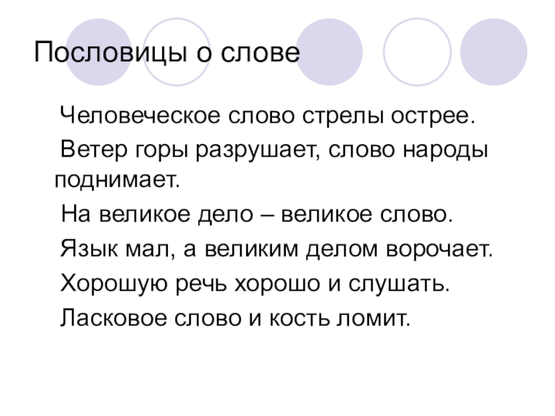 Пословицы о слове  Человеческое слово стрелы острее.  Ветер горы разрушает, слово народы поднимает.  На