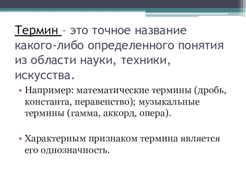 Например: математические термины (дробь, константа, неравенство); музыкальные термины (гамма, аккорд, опера).