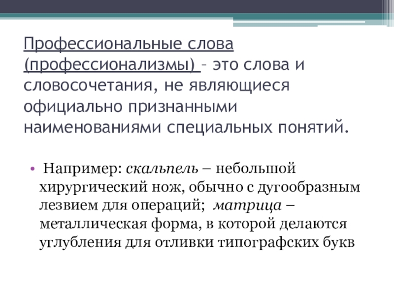 Например: скальпель – небольшой хирургический нож, обычно с дугообразным лезвием для операций; матрица – металлическая форма, в которой делаются углубления для отливки типографских букв