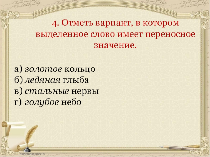 4. Отметь вариант, в котором выделенное слово имеет переносное значение.а)	золотое кольцоб)	ледяная глыбав)	стальные нервыг)	голубое небо