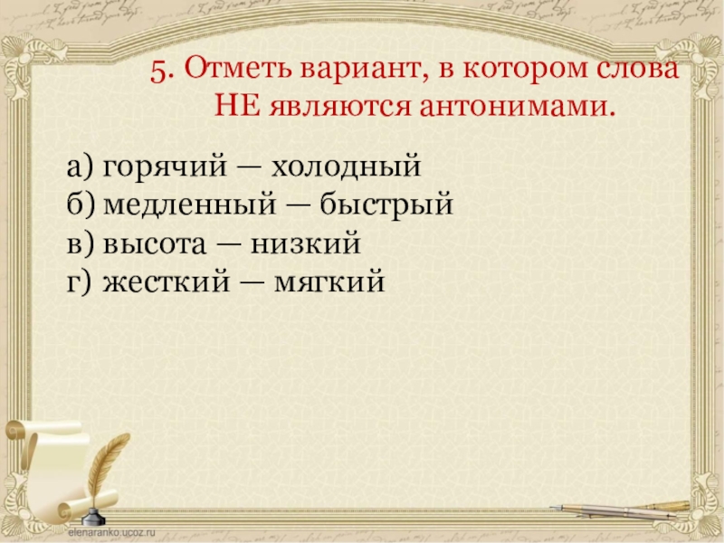 5. Отметь вариант, в котором слова НЕ являются анто­нимами.а)	горячий — холодныйб)	медленный — быстрыйв)	высота — низкийг)	жесткий — мягкий