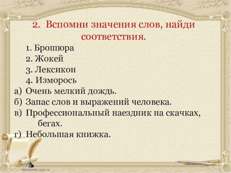 2. Вспомни значения слов, найди соответствия. 1. Брошюра2. Жокей3. Лексикон4. Изморосьа)	Очень мелкий дождь.б)	Запас слов и выражений