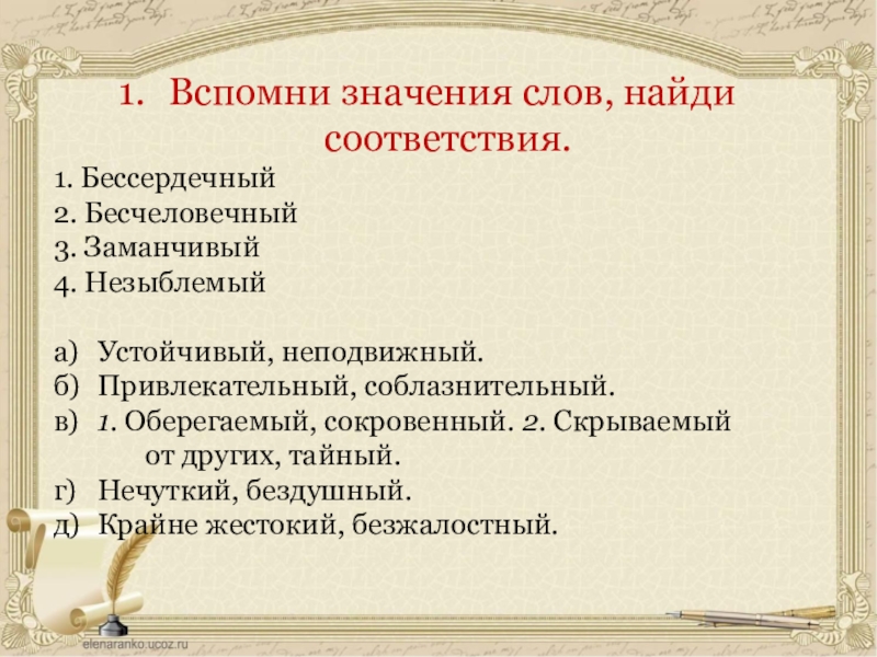 Вспомни значения слов, найди соответствия. 1. Бессердечный2. Бесчеловечный3. Заманчивый4. Незыблемыйа)	Устойчивый, неподвижный.б)	Привлекательный, соблазнительный.в)	1. Оберегаемый, сокровенный. 2. Скрываемый