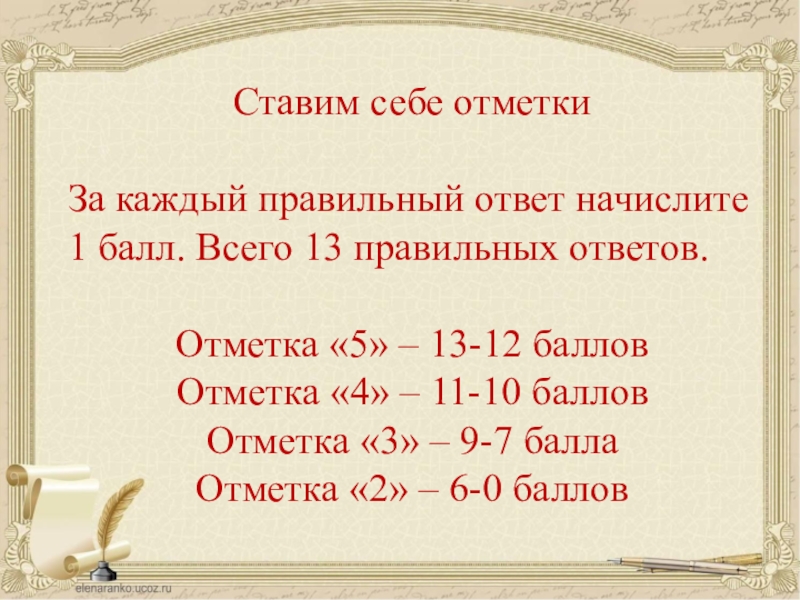 Ставим себе отметкиЗа каждый правильный ответ начислите 1 балл. Всего 13 правильных ответов.Отметка «5» – 13-12 балловОтметка