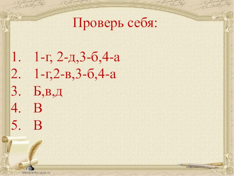 Проверь себя:1-г, 2-д,3-б,4-а1-г,2-в,3-б,4-аБ,в,дВВ