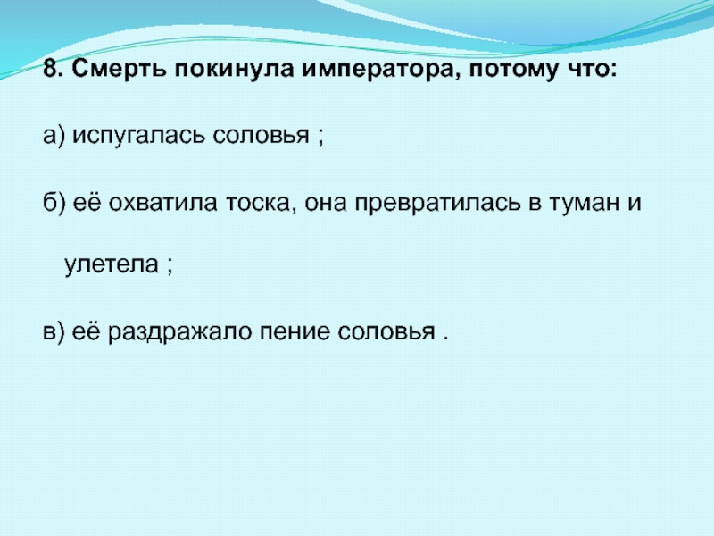 8. Смерть покинула императора, потому что: а) испугалась соловья ; б) её охватила тоска, она превратилась в