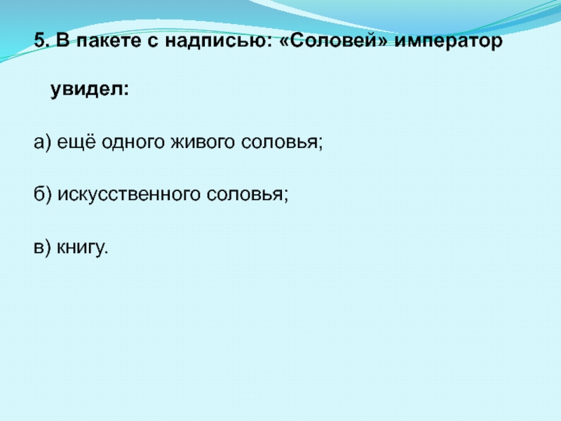5. В пакете с надписью: «Соловей» император увидел: а) ещё одного живого соловья; б) искусственного соловья; в)