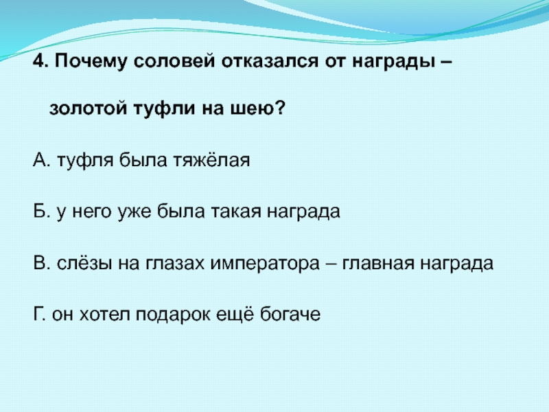 4. Почему соловей отказался от награды – золотой туфли на шею?А. туфля была тяжёлаяБ. у него уже