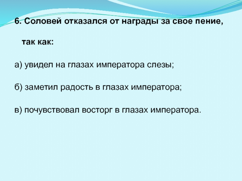 6. Соловей отказался от награды за свое пение, так как: а) увидел на глазах императора слезы; б)