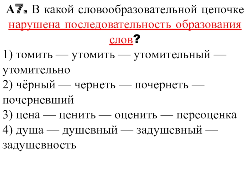 Слайд 8А7. В какой словообразовательной цепочке нарушена последовательность образования слов?
