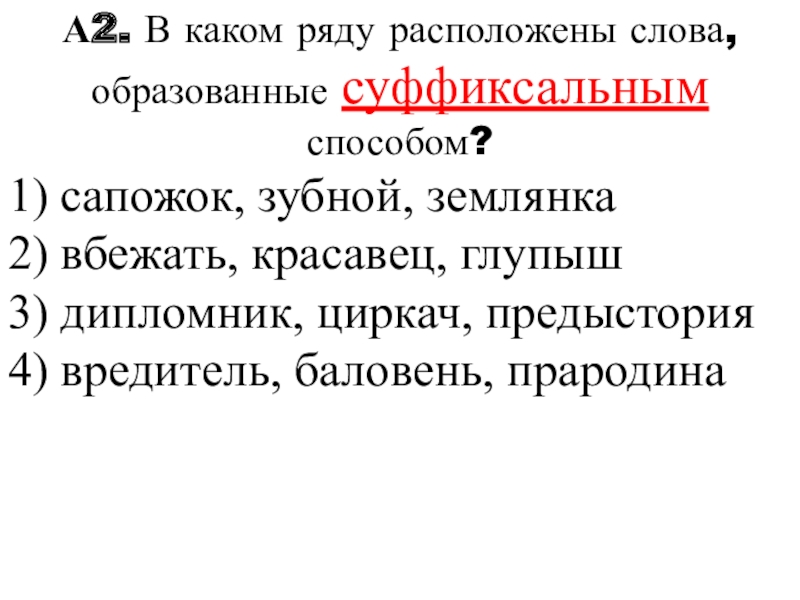 Слайд 3А2. В каком ряду расположены слова, образованные суффиксальным способом?