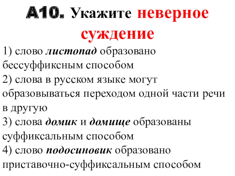 A10. Укажите неверное суждение1) слово листопад образовано бессуффиксным способом 2) слова в русском языке могут образовываться переходом одной части речи