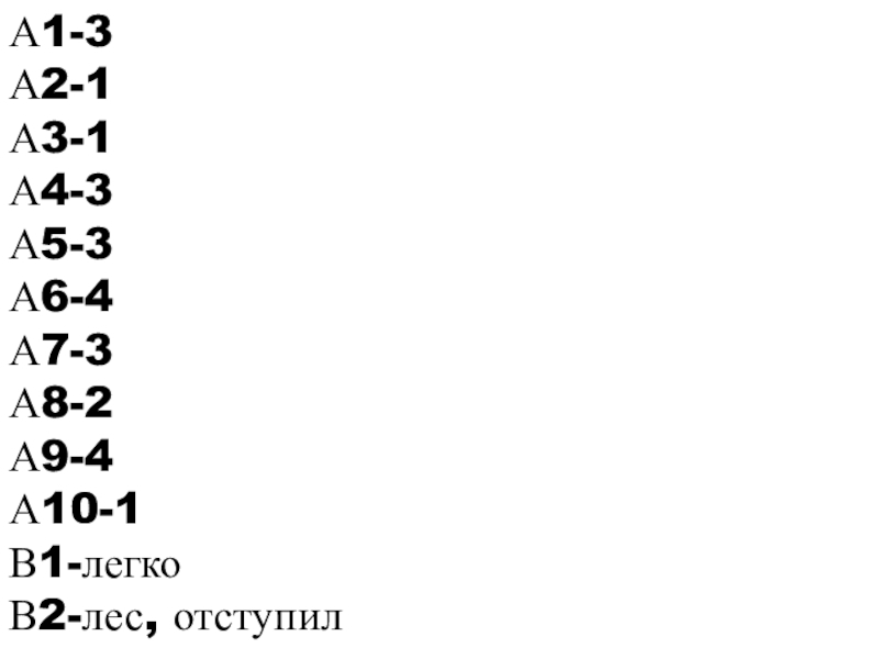 Слайд 13А1-3 А2-1 А3-1 А4-3 А5-3 А6-4 А7-3 А8-2 А9-4 А10-1 В1-легко В2-лес, отступил