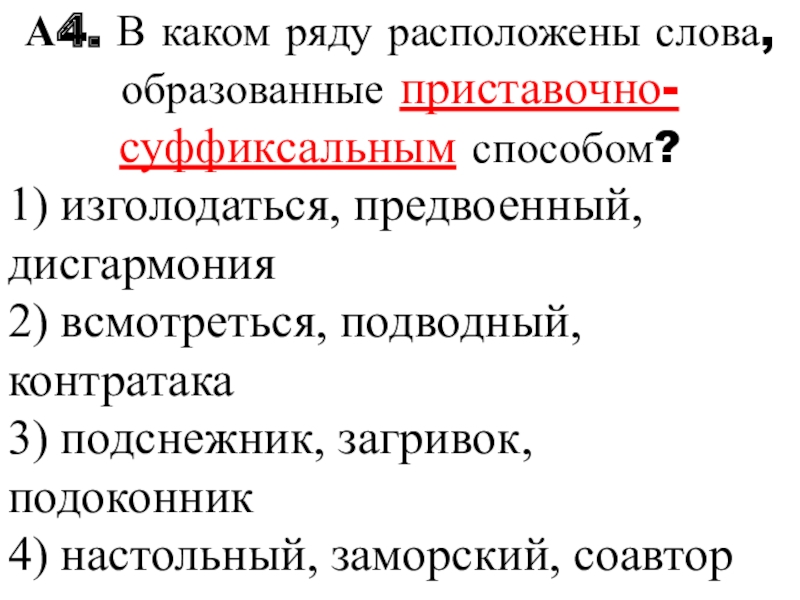Слайд 4А3. В каком ряду расположены слова, образованные приставочным способом?