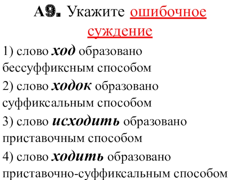 А9. Укажите ошибочное суждение1) слово ход образовано бессуффиксным способом 2) слово ходок образовано суффиксальным способом 3) слово исходить образовано приставочным способом 4) слово ходить образовано приставочно-суффиксальным