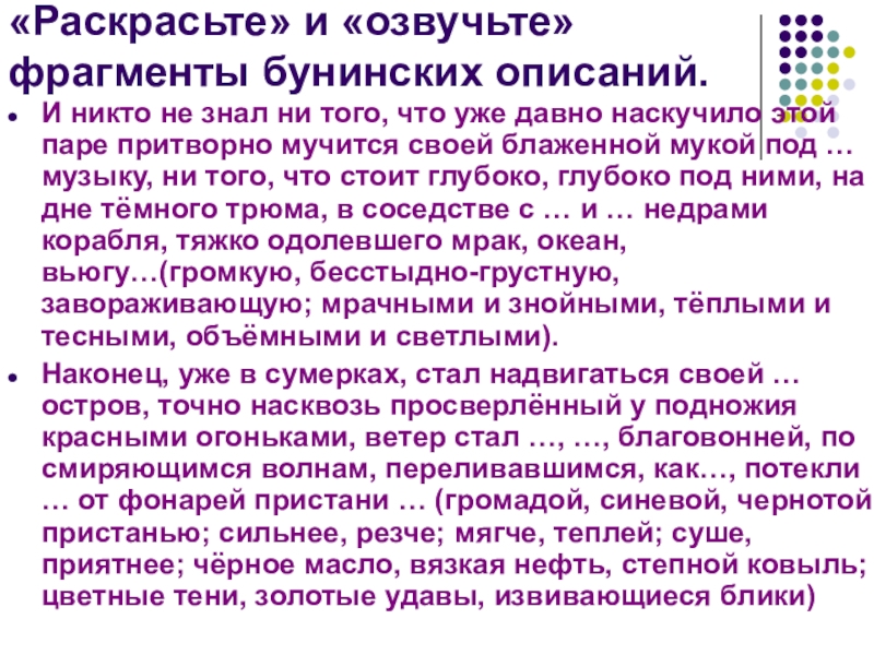 Слайд 8«Раскрасьте» и «озвучьте» фрагменты бунинских описаний.