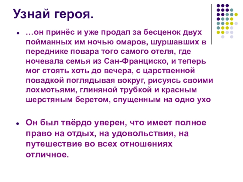ночью омаров, шуршавших в переднике повара того самого отеля, где ночевала семья из Сан-Франциско, и теперь мог стоять хоть до вечера, с царственной повадкой поглядывая вокруг, рисуясь своими лохмотьями, глиняной трубкой и красным шерстяным беретом, спущенным на одно ухо