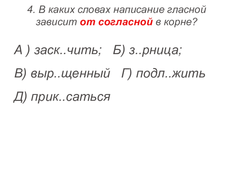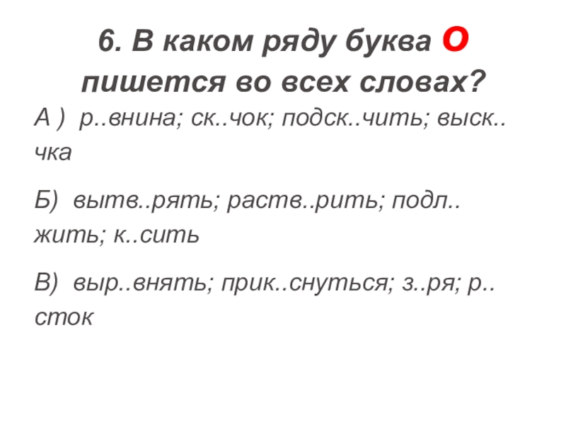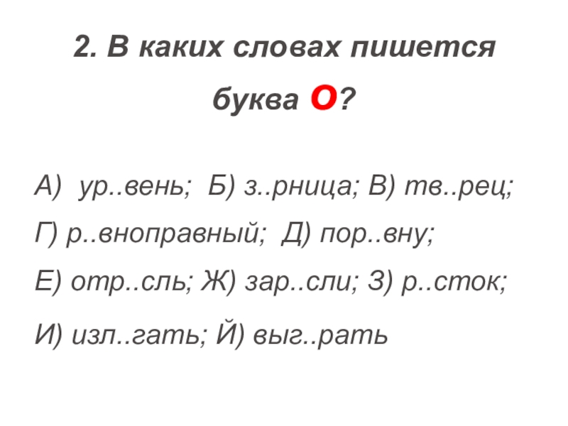 В) ур..внение; Г) р..стущий; Д) к..снуться; Е) р..стение; Ж) р..сток; З) отр..сль; И) Р..стов; Й) р...внина