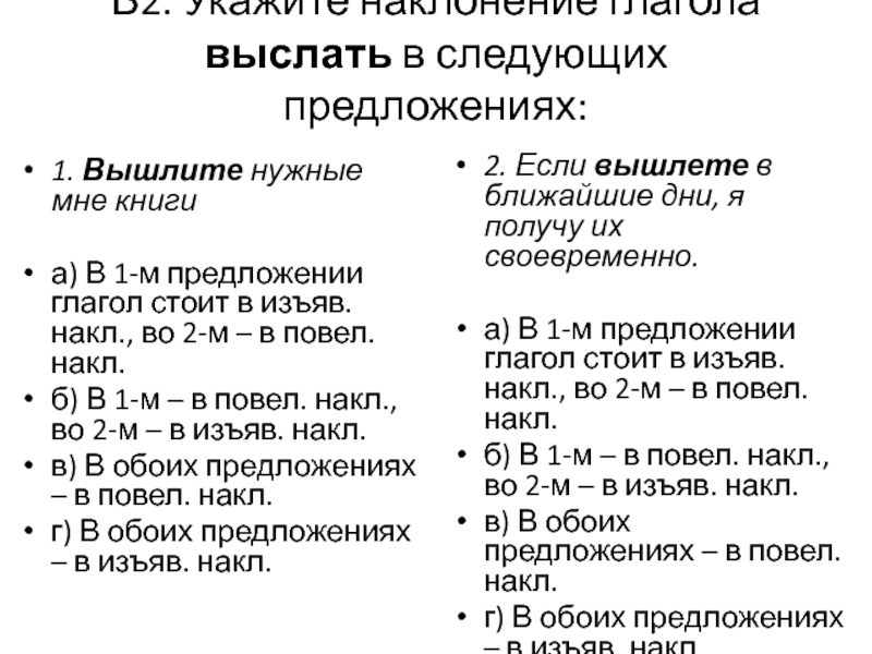 б) В 1-м – в повел. накл., во 2-м – в изъяв. накл.