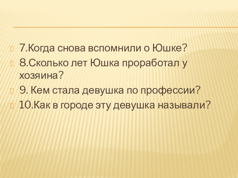 7.Когда снова вспомнили о Юшке?8.Сколько лет Юшка проработал у хозяина?9. Кем стала девушка по профессии?10.Как в городе