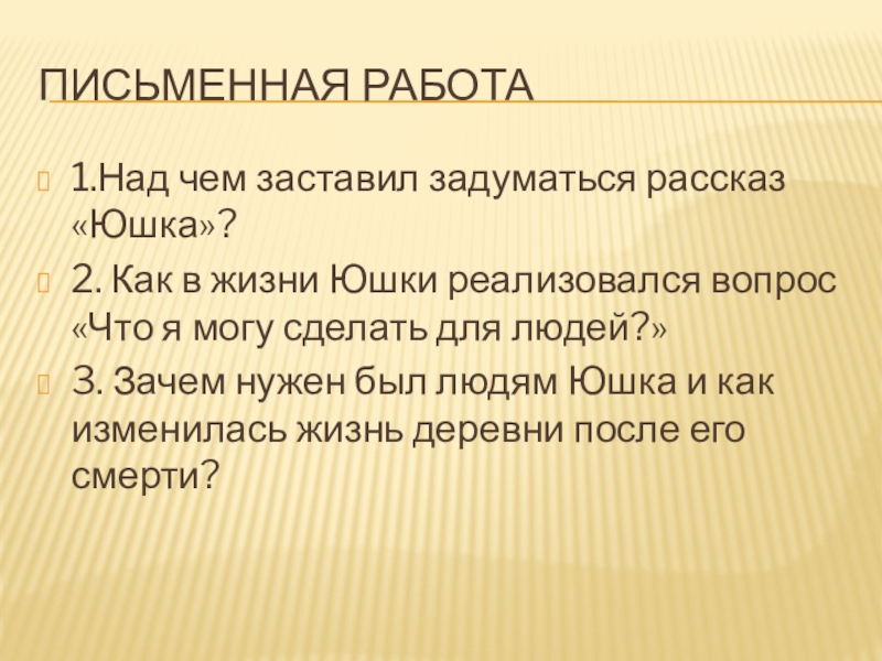 Письменная работа1.Над чем заставил задуматься рассказ «Юшка»?2. Как в жизни Юшки реализовался вопрос «Что я могу сделать