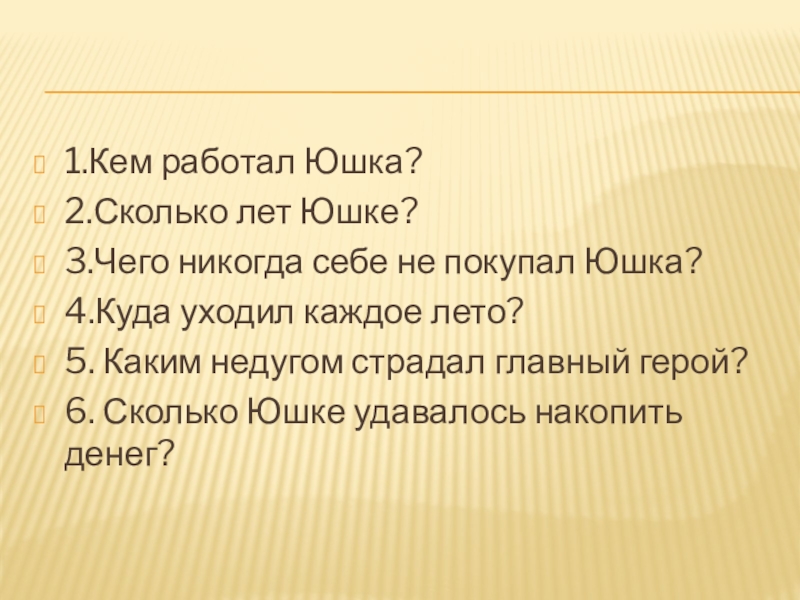 1.Кем работал Юшка?2.Сколько лет Юшке?3.Чего никогда себе не покупал Юшка?4.Куда уходил каждое лето?5. Каким недугом страдал главный
