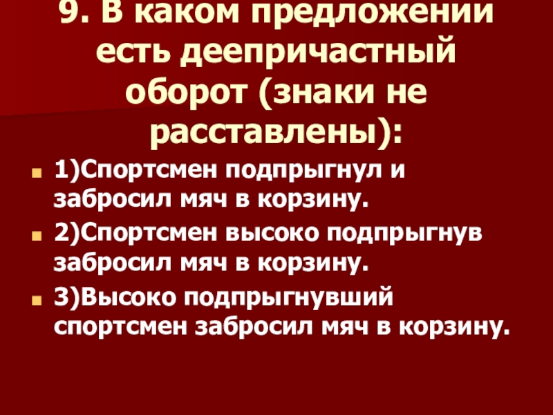 3)Высоко подпрыгнувший спортсмен забросил мяч в корзину.