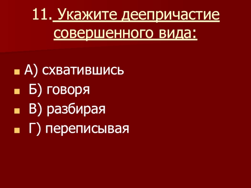 Слайд 1111. Укажите деепричастие совершенного вида: