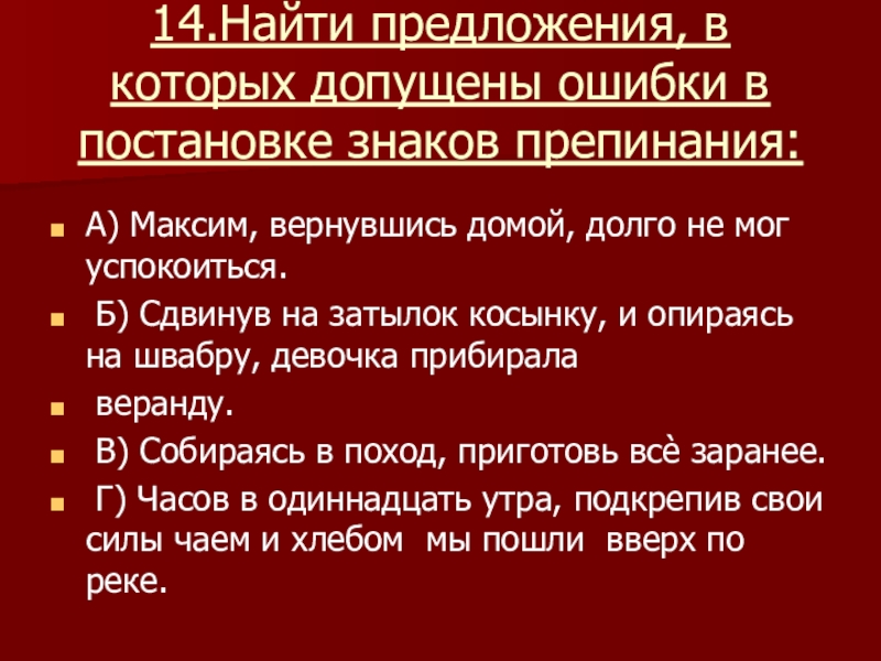 Слайд 1414.Найти предложения, в которых допущены ошибки в постановке знаков препинания: