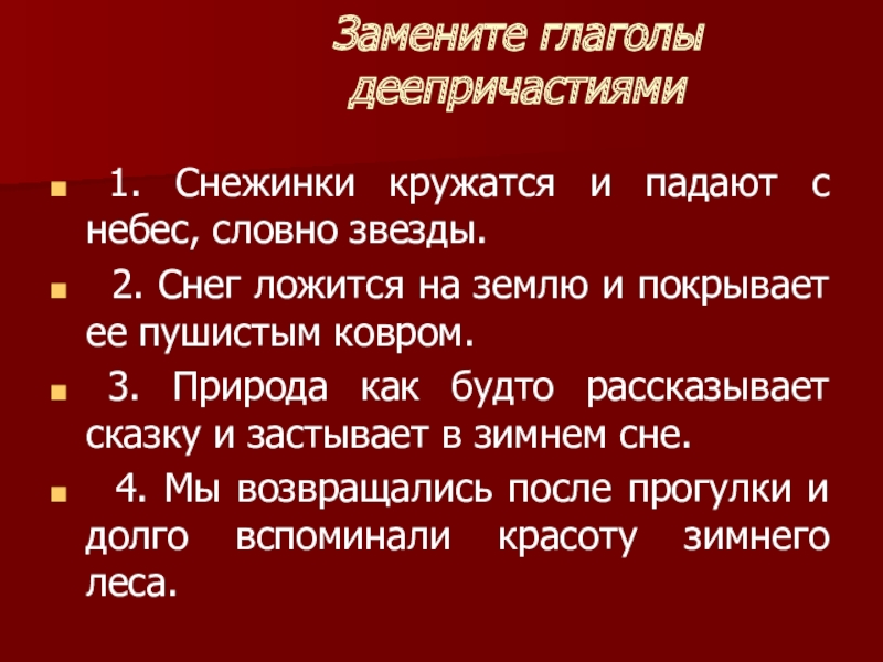 4. Мы возвращались после прогулки и долго вспоминали красоту зимнего леса.