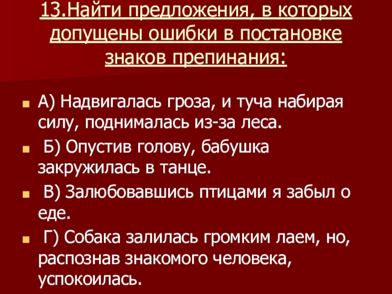 Слайд 1313.Найти предложения, в которых допущены ошибки в постановке знаков препинания: