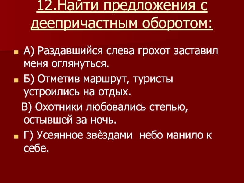 Слайд 1212.Найти предложения с деепричастным оборотом: