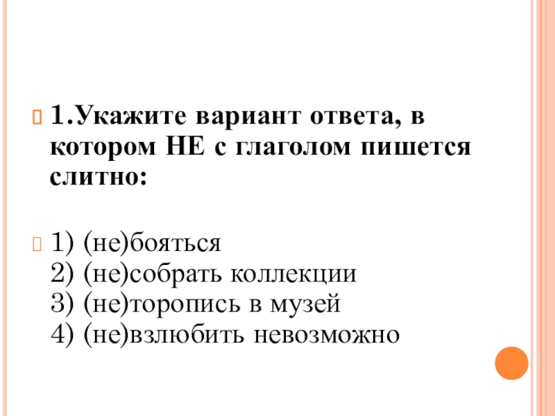 1.Укажите вариант ответа, в котором НЕ с глаголом пишется слитно:  1) (не)бояться 2) (не)собрать коллекции 3) (не)торопись в музей 4) (не)взлюбить невозможно