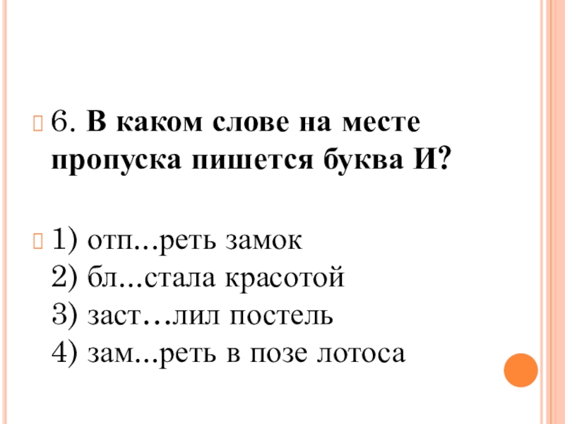 замок 2) бл...стала красотой 3) заст…лил постель 4) зам...реть в позе лотоса
